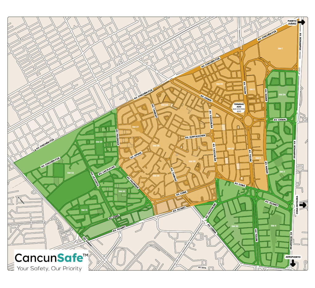 Green Zones (Recommended): These sectors represent the safest areas for tourists to walk, dine, and stay. They include areas with high surveillance, better infrastructure, and proximity to the Hotel Zone and main avenues like Av. Bonampak.